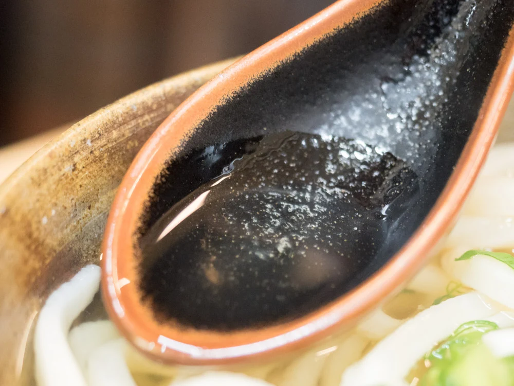 ▼ぶっかけの濃いめのつゆは、あまめの味付けで、倉敷名物のぶっかけうどんの風味です。