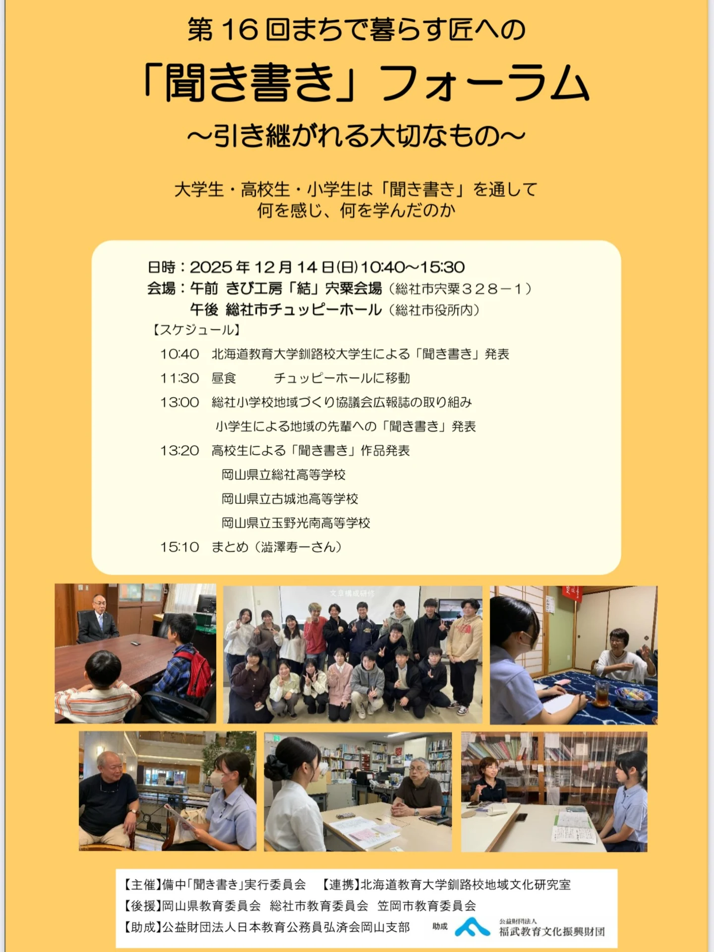 まちで暮らす匠(たくみ)への「聞き書き」フォーラムは、高校生や大学生が書いた聞き書き作品の発表の場です。当日は、連携している北海道教育大学釧路校地域文化研究会とリモートでつなぎ、発表をしました。