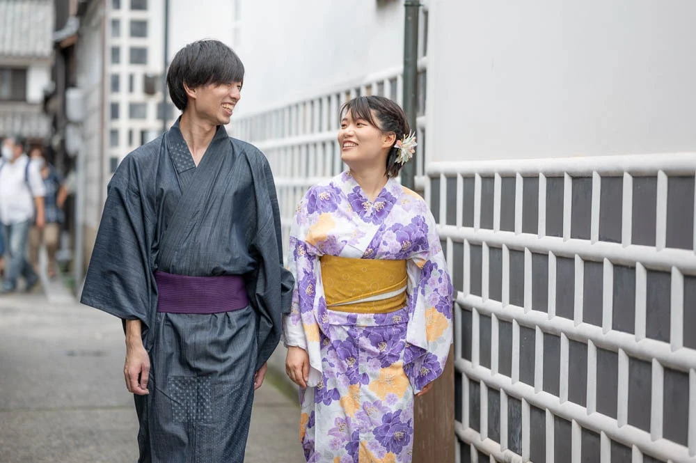 女性は白地に牡丹と百合柄の浴衣、男性は浴衣として着られるデニム着物を選びました。
