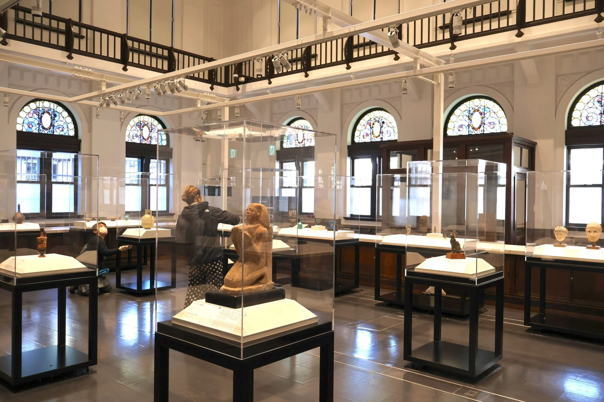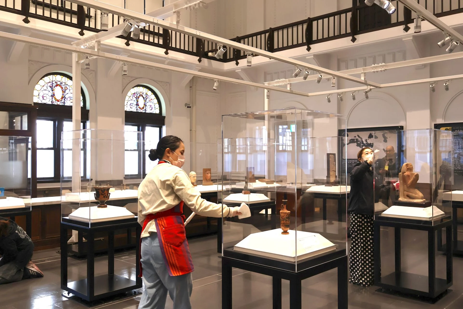 吹き抜け構造のため、2階部分の欄干(手すり)などに溜まったホコリが落ちます。そこで、展示ケースの清掃前に、まず2階部分の欄干や手すりを掃除していました。