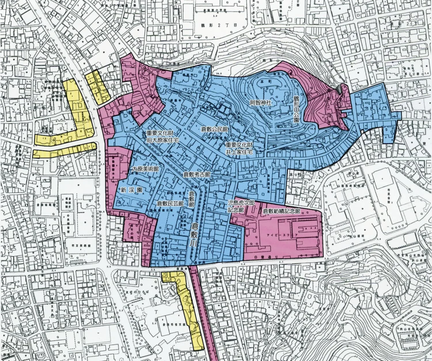 本稿で定義する「倉敷美観地区」とは、倉敷市倉敷川畔伝統的建造物群保存地区(第一種美観地区)として国から選定されているエリア(下図で背景が「青色」のエリア)とします。