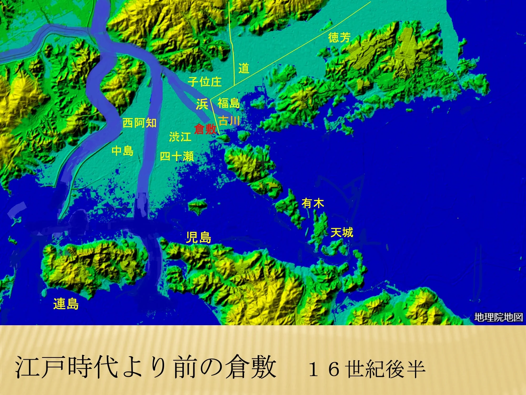 倉敷の土地はその後干拓によって飛躍的に増えていきますが、美観地区の辺りまでは干拓地ではなく沖積地です(倉敷市浜町の地名は海辺であった時代の名残と思われます)。