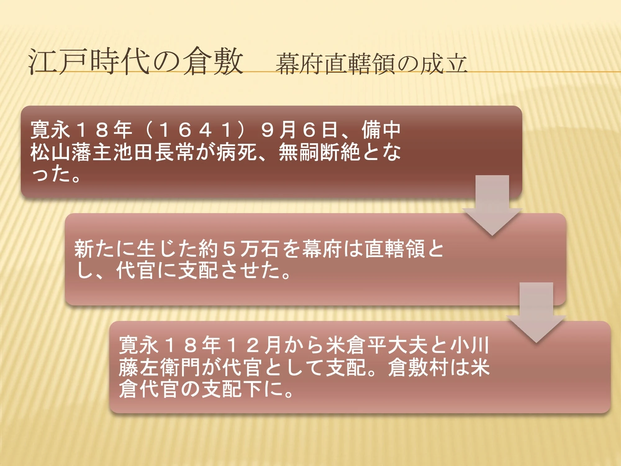 その後、備中国の松山藩領として池田長幸・長常の時代が続きますが、1641年に池田長常が死去し無嗣断絶(跡継ぎがいないまま当主が死去し、家が取り潰しになること)となった結果、倉敷村は幕府の直轄領となります。