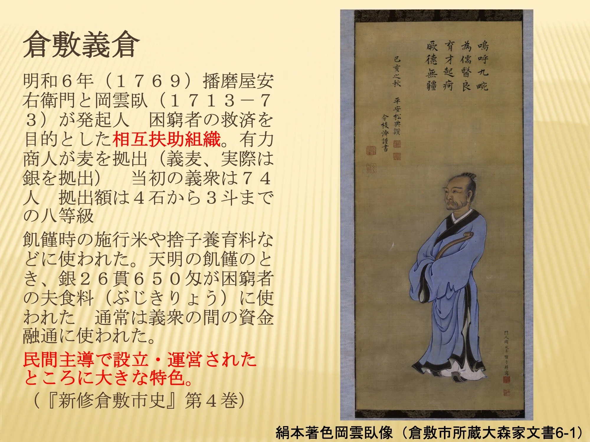 倉敷義倉は現在でいう困窮者を救済する福祉制度です。このような制度が、支配者層ではなく民間主導で設立・運営されたことから、当時の倉敷村の民衆の「町に対する想い」をうかがい知ることができます。
