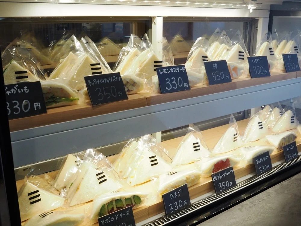 お店のショーケースには色鮮やかなフルーツサンドが並び、いつ訪れても旬の果物が楽しめます。